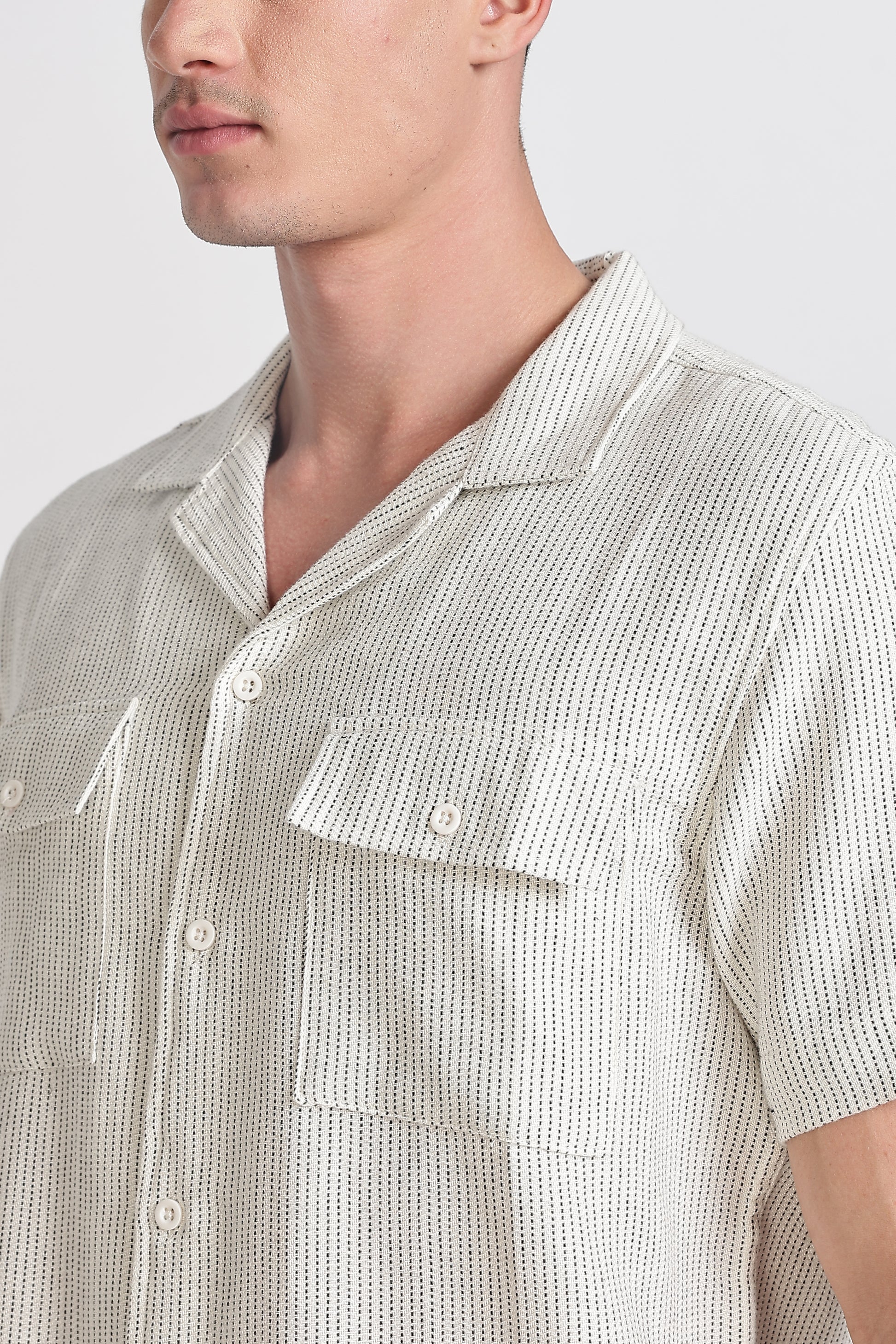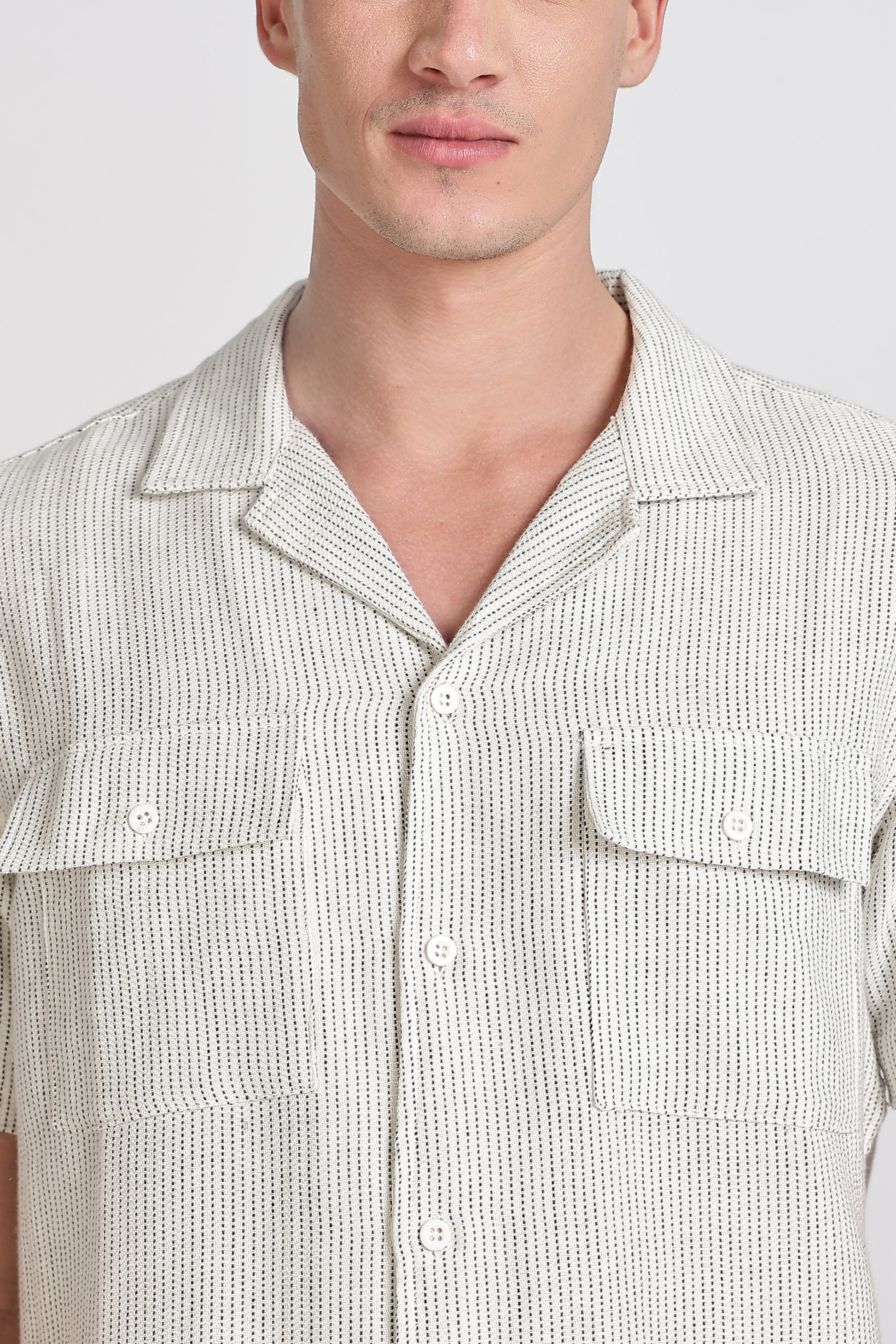 RELAXED YET POLISHED, THIS REGULAR-FIT SHIRT IS MADE FROM BREATHABLI TEXTURED FABRIC FOR ALL-DAY COMFORT. DESIGNED WITH A RESORT COLLAR, DOUBLE FLAP CHEST POCKETS, AND A CLEAN BUTTON-UP FRONT WITHOUT A PLACKET, IT FEATURES SHORT SLEEVES, A BACK YOKE, AND A STRAIGHT-CUT HEM-YOUR GO-TO FOR EFFORTLESS, EVERYDAY STYLE.